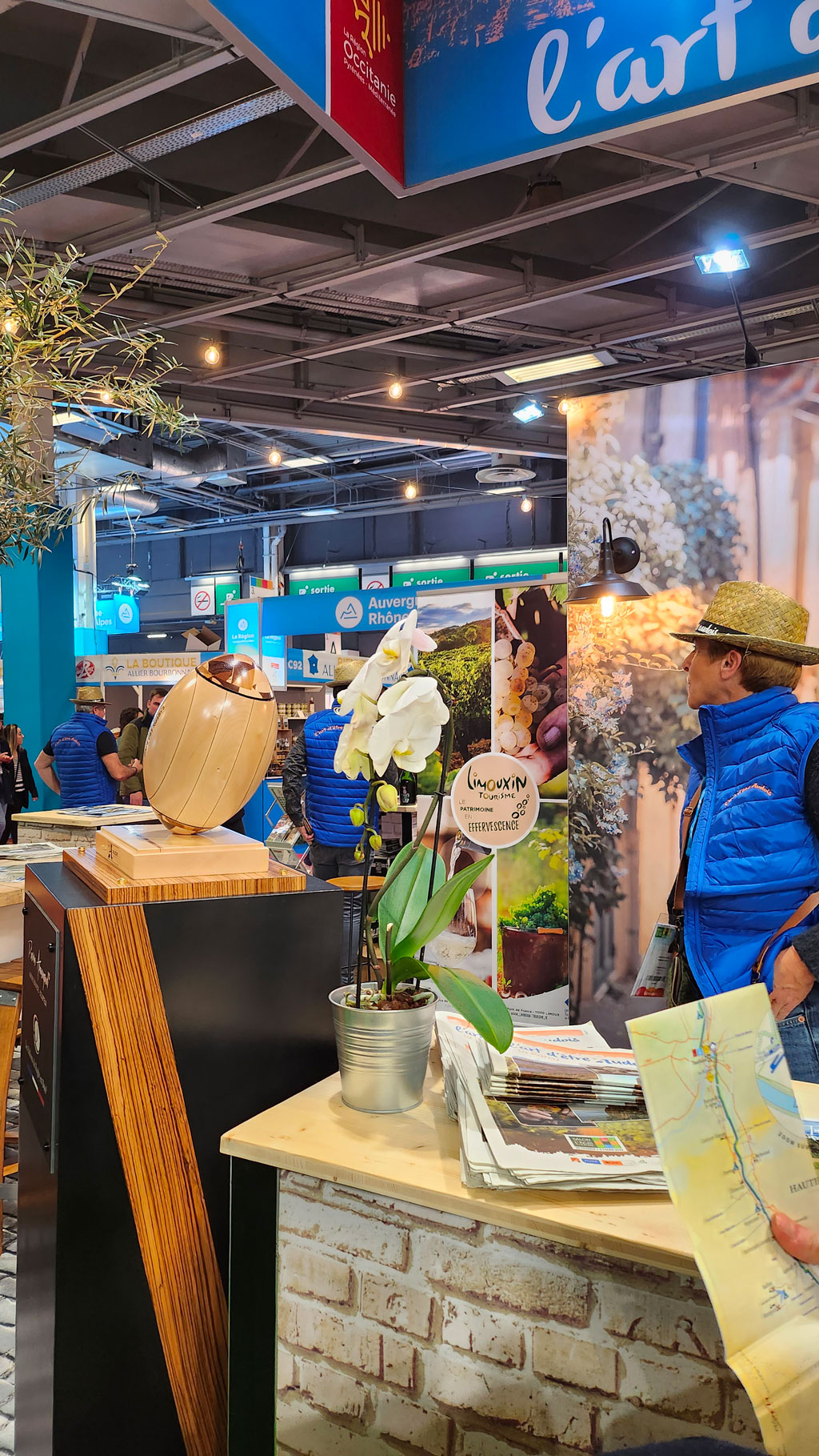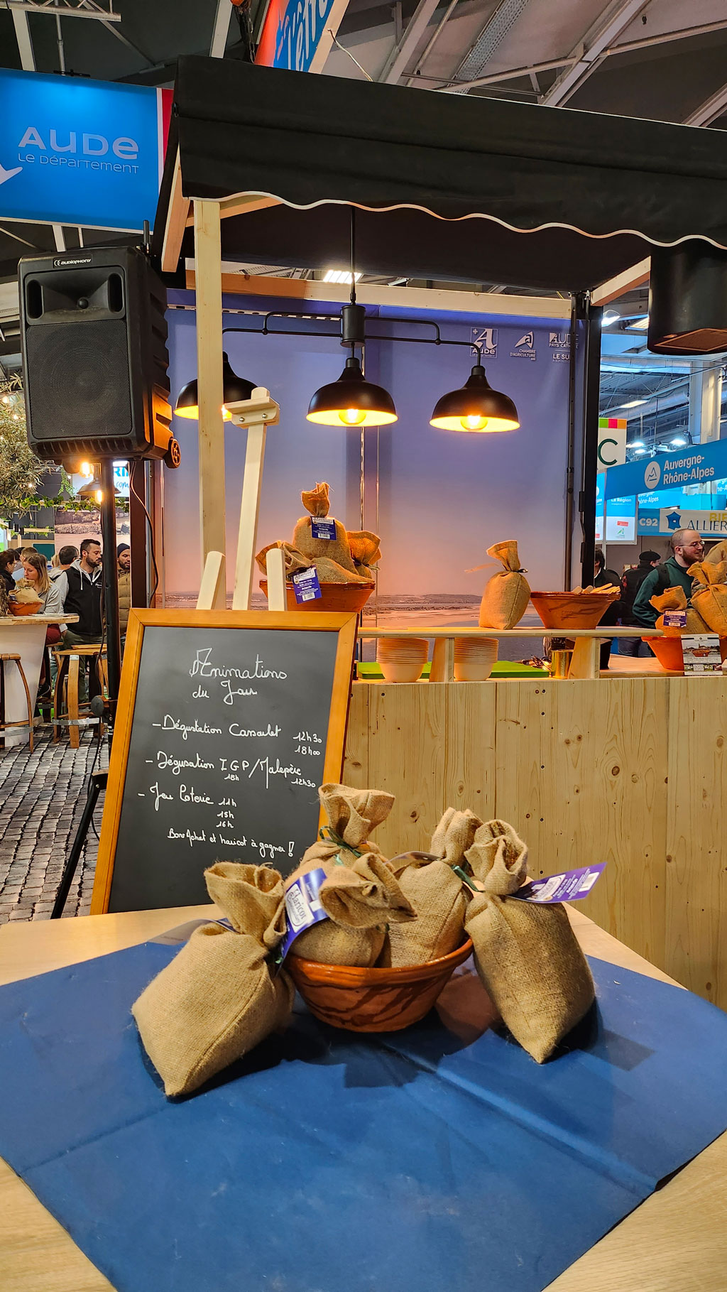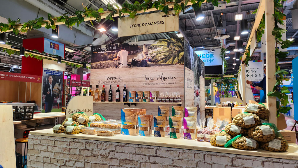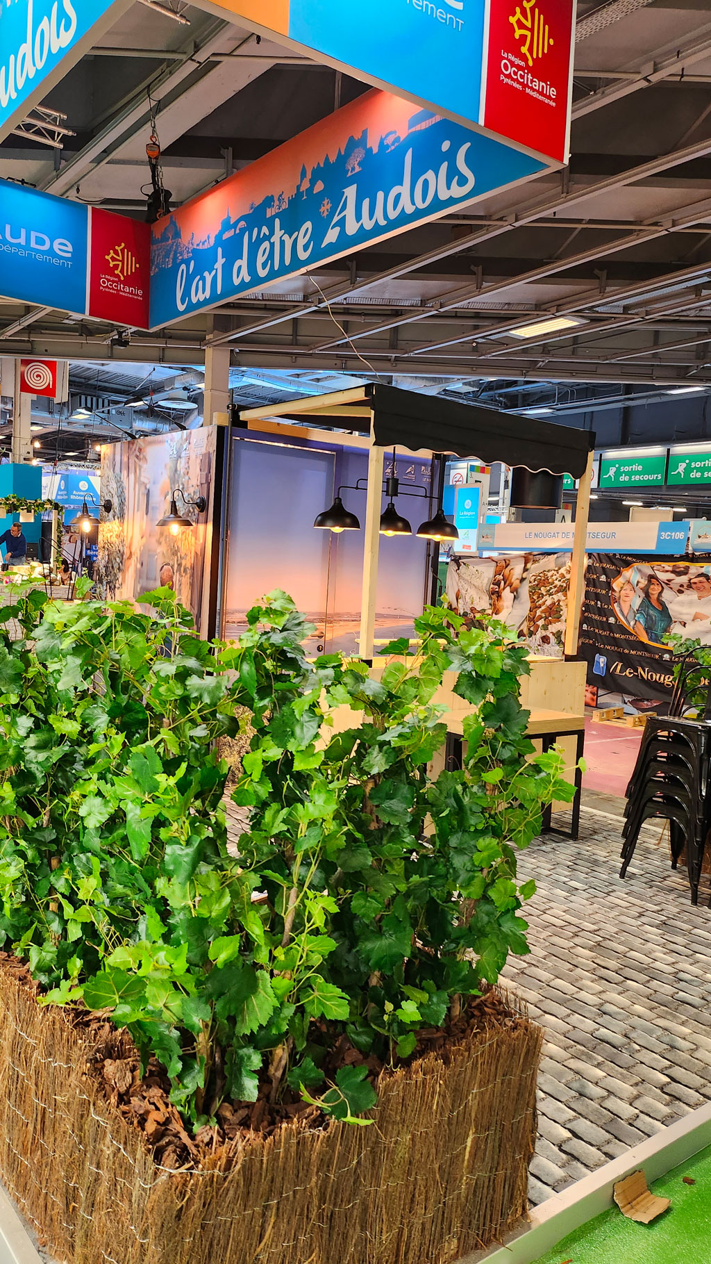 L'ilôt central été réservé au département de l'Aude avec un côté animation et la mise en place d'une petite cuisine pour les animations culinaire , d'un espace vip moduable ,de 3 desks d'accueil et d'un mange debout avec un olivier central , le tout dans un esprit "place de village Audois".