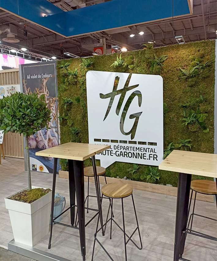 L’ensemble des éléments en bois sont issu d’une scierie locale et le mur végétal fut recyclé pour un autre évènement.