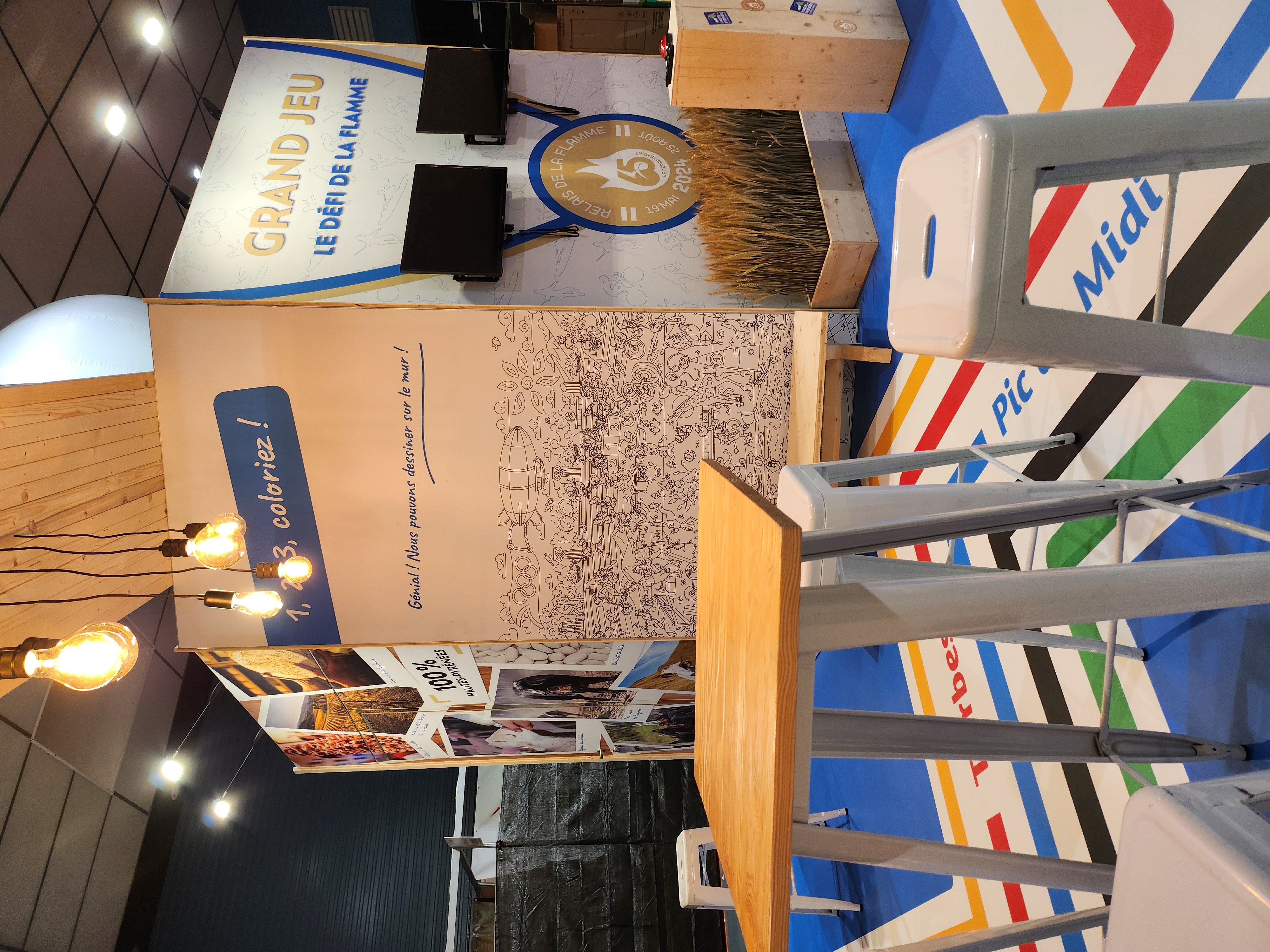 Nous avons posé un sol lino personnalisé qui met en avant les villes étapes pour le passage de la flamme Olympique avec un espace détente mange debout et tabourets.