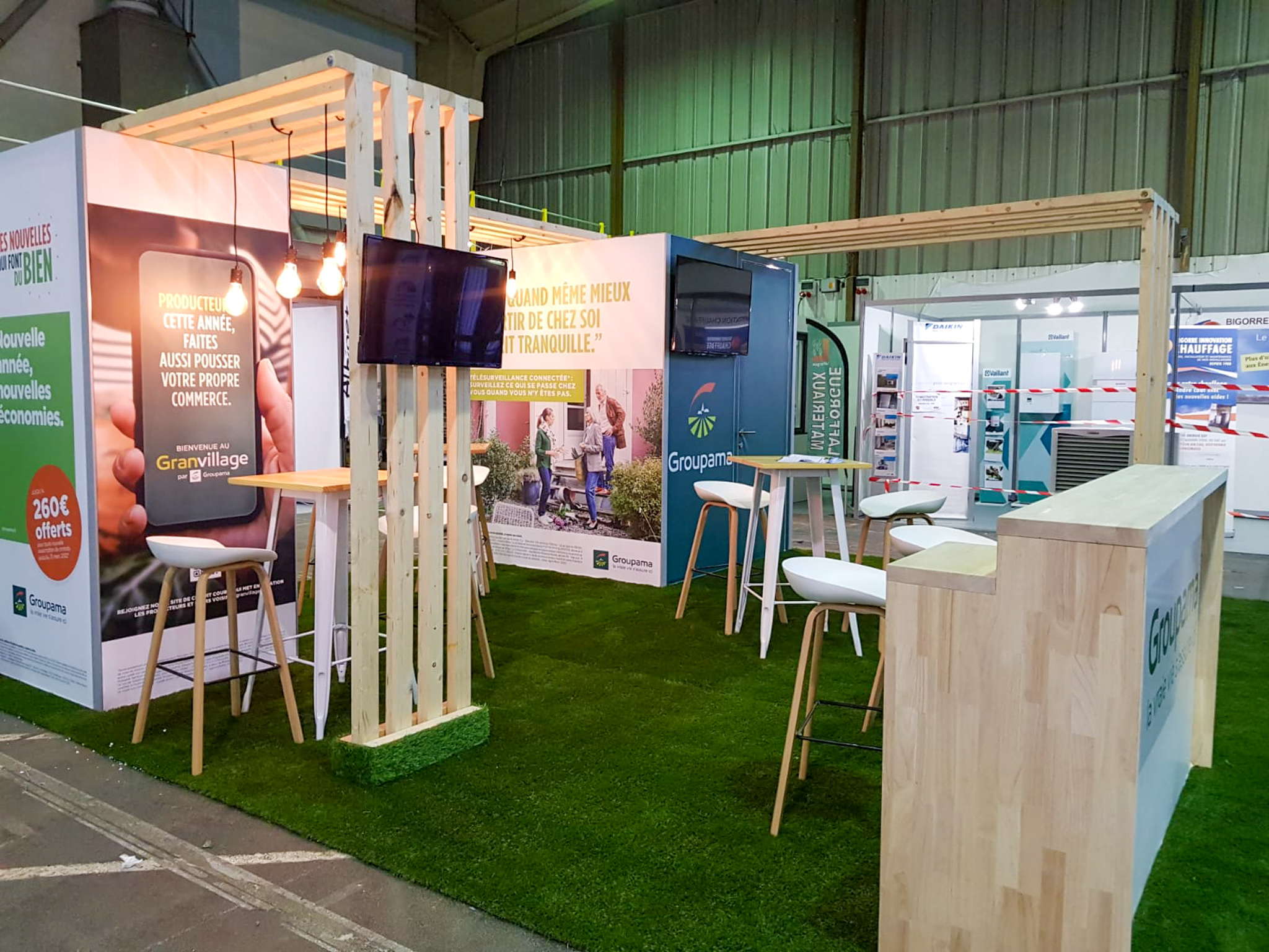 Une banque d'accueil pour informer les clients, un sol en herbe synthétique que l'on pourra réutiliser toujours dans une démarche " éco responsabilité ".