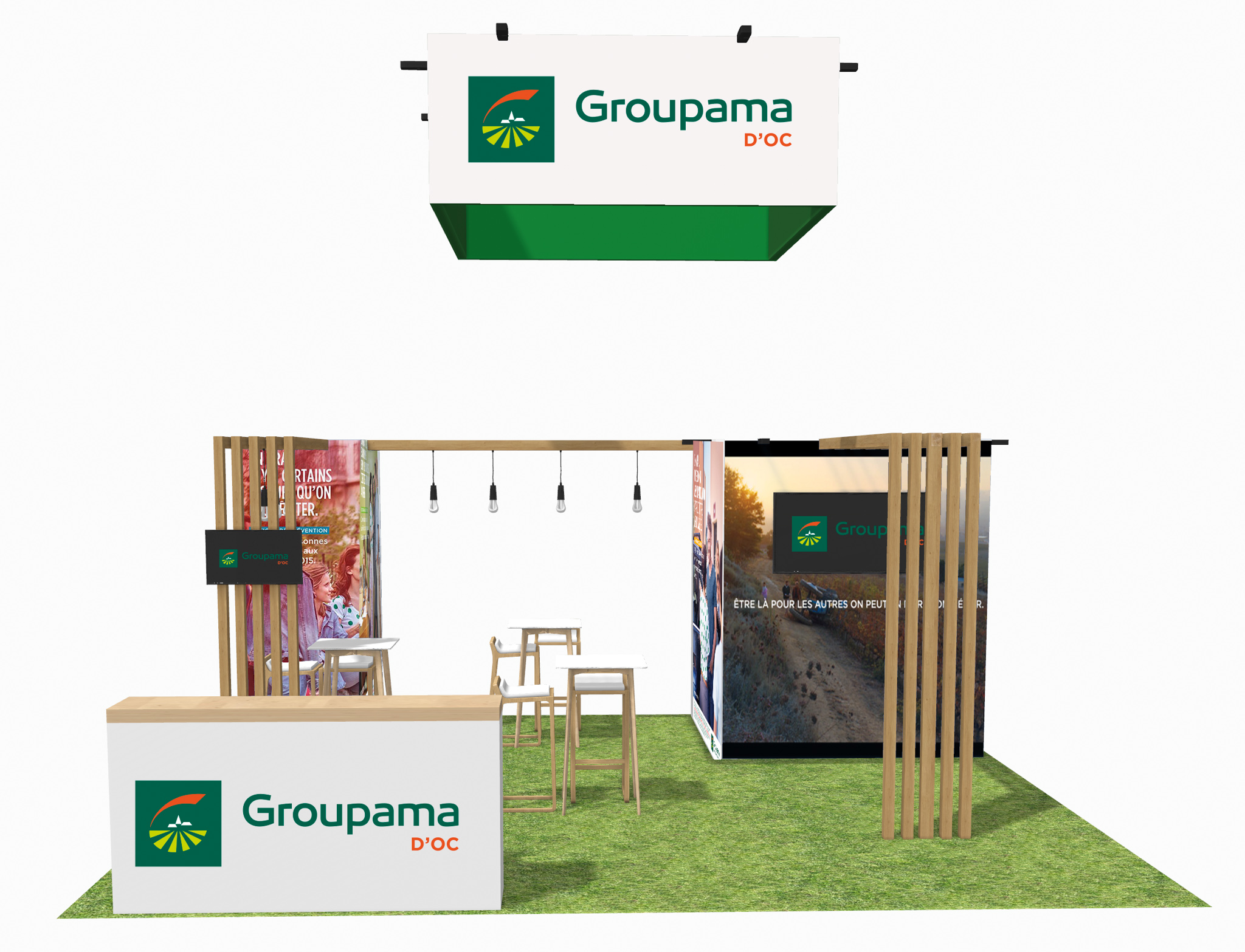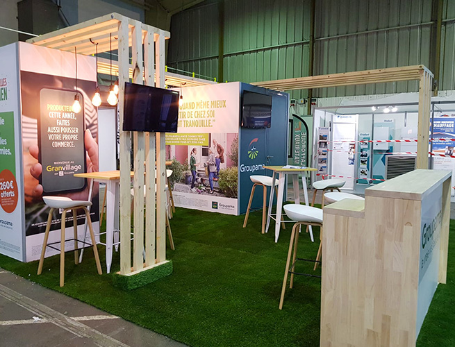 Concevoir sur une parcelle de 36 m² un stand sur mesure, une conception au design épuré avec des matériaux réutilisables comme la pergola en bois qui définie un espace de discussion libre, avec deux écrans TV afin de pouvoir diffuser des informations.