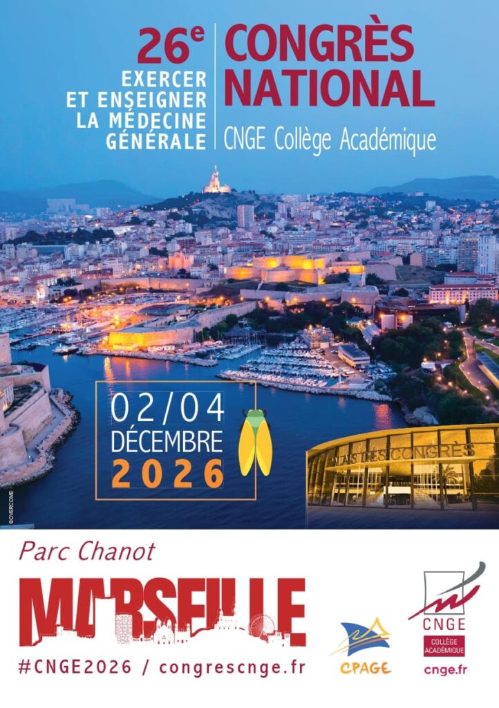 Le Congrès CNGE 2025 se tiendra du 2 au 4 décembre 2026 au Parc Chanot de Marseille. Ce rendez-vous annuel rassemble plus de 3 000 professionnels de la médecine générale : enseignants, internes, chercheurs, maîtres de stage... C’est un moment fort pour la discipline, rythmé par des conférences, ateliers, communications scientifiques et échanges de terrain.